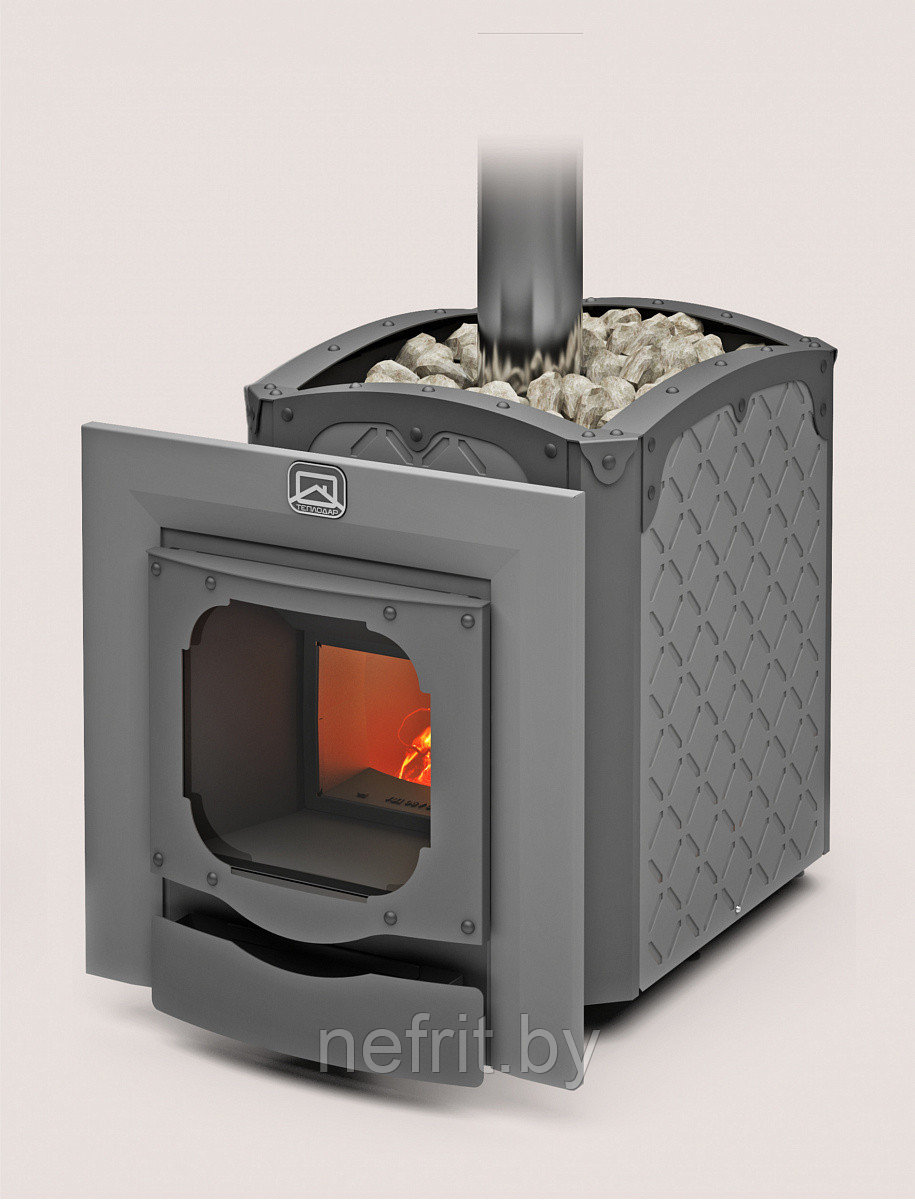 Чугунные топки для «Былины» мы производим в собственном литейном цеху из серого чугуна по ГОСТ 1412-85. Классическая внешняя каменка с легкостью вместит 60 кг камней. Глубокая топка позволяет использовать дрова длиной до 490 мм!