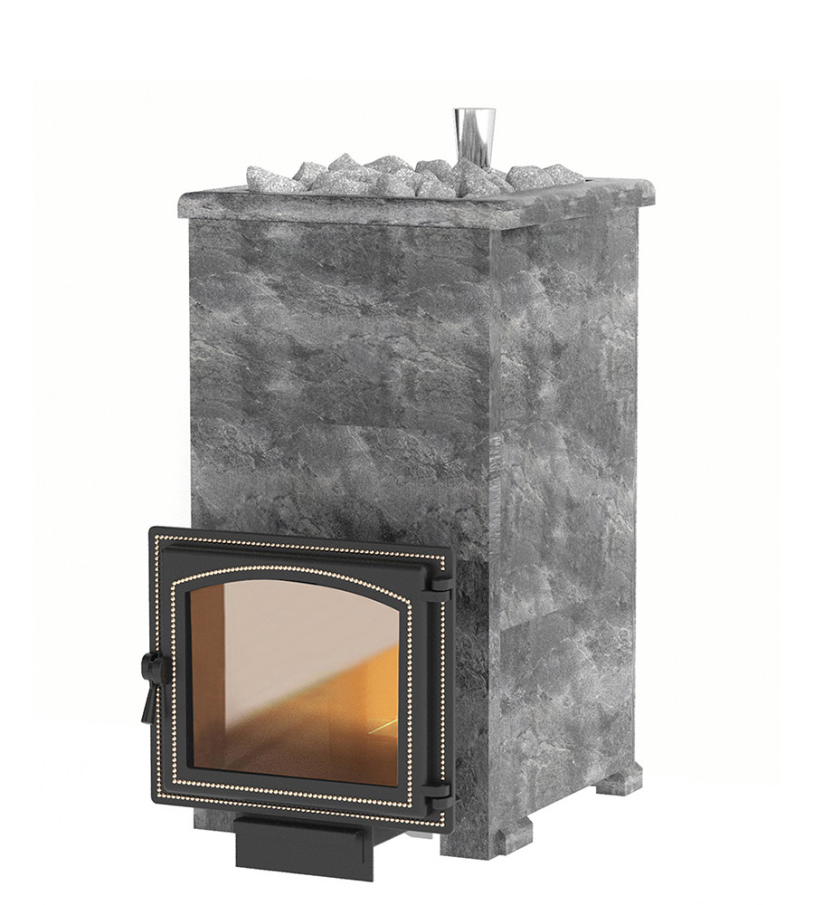 Данную модель печи отличает от аналогов то, что закрытая каменка расположена внутри топки. Это позволяет максимально быстро и хорошо прогревать камни, которые расположены внутри каменки. На камни через специальную трубку с отверстиями поддается вода, которая моментально испаряется, превращаясь в мелкодисперсный пар.