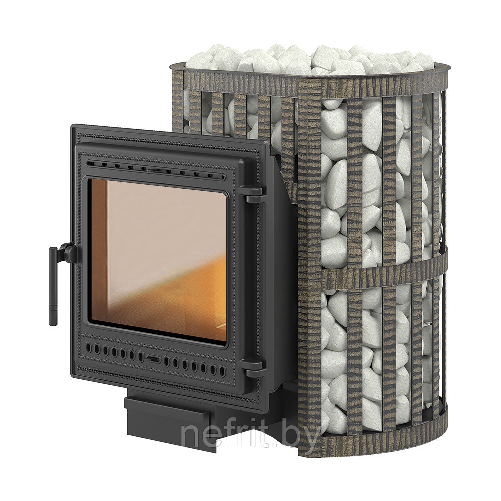 Печь комплектуется чугунной герметичной дверцей Везувий 205, которая оснащена жаропрочным стеклом «SCHOTT ROBAX». Это стекло не только позволяет наблюдать за процессом горения, но и защищает от перегрева внешней поверхности дверцы. Конструкция печи также включает конвекционно-вентилируемый кожух "Ковка", выполненный из металлической текстурированной полосы. Кожух покрыт термостойкой краской и оформлен патиной цвета «Бронза», что придает устройству эстетически привлекательный вид и увеличивает его прочность.