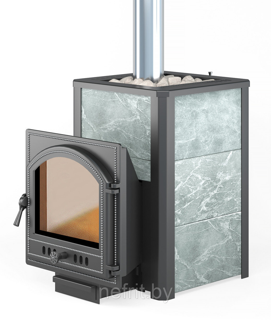 Конвекционно–вентилируемая облицовка, изготовленная из экологически чистой горной породы , который обладает большой теплоёмкостью, что позволяет камню в короткие сроки нагреваться и максимально долго удерживать стабильную температуру в парильном помещении, а также гасить жёсткое инфракрасное излучение Камень обладает исключительными лечебными свойствами: помогает при головных болях, при нестабильном артериальном давлении, при простудных заболеваниях, воспалительных процессах в почках и пищеварительной системе, снимает повышенную возбудимость и нервозность, сглаживает эмоциональные всплески. Облицовка из натурального камня при нагреве способна аккумулировать тепло, что гарантирует максимально равномерный прогрев и сохранение тепла Банная печь ЛЕГЕНДА 22 (205) укомплектован чугунной каминной, самоохлаждаемой дверцей Везувий 205 с большим жаропрочным стеклом «SCHOTT ROBAX», с оборудованной системой самоочистки, что позволяет визуально контролировать горение и любоваться видом живого огня. Данная печь рассчитана на объем парильного помещения 12-24 м3.